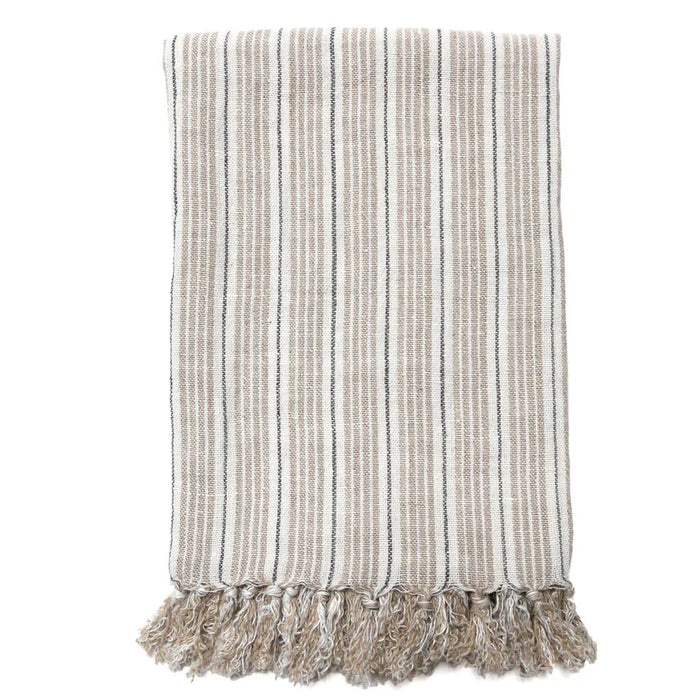 The Newport Throw is hand-loomed using heavy weight European linen with tassels along the edges. The classic stripe pattern in white, natural and midnight lends itself to a variety of design styles.